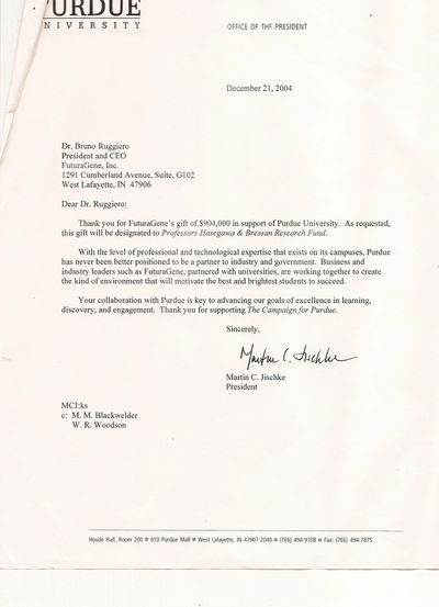In 2004 Dr. Bruno Ruggiero provides a $1 million USD gift to Purdue University to promote research on Osmotin's human health applications.