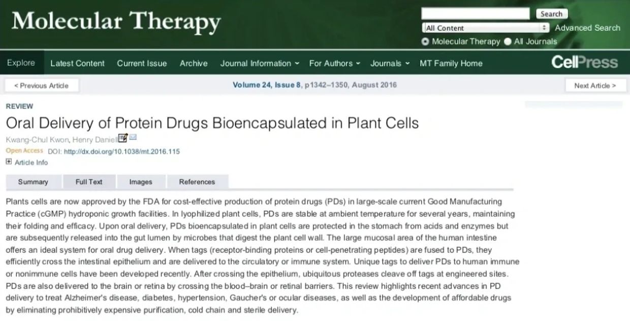 The Food and Drug Administration (FDA) has identified our method of protein production as the absolute best due to the plant cells' ability to protect the proteins from being broken down in the digestive tract and only releasing them in the gut for a more powerful and beneficial therapeutic effect.